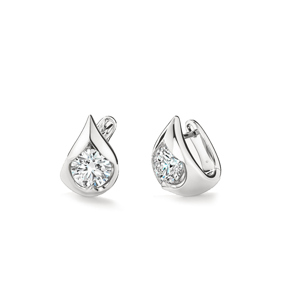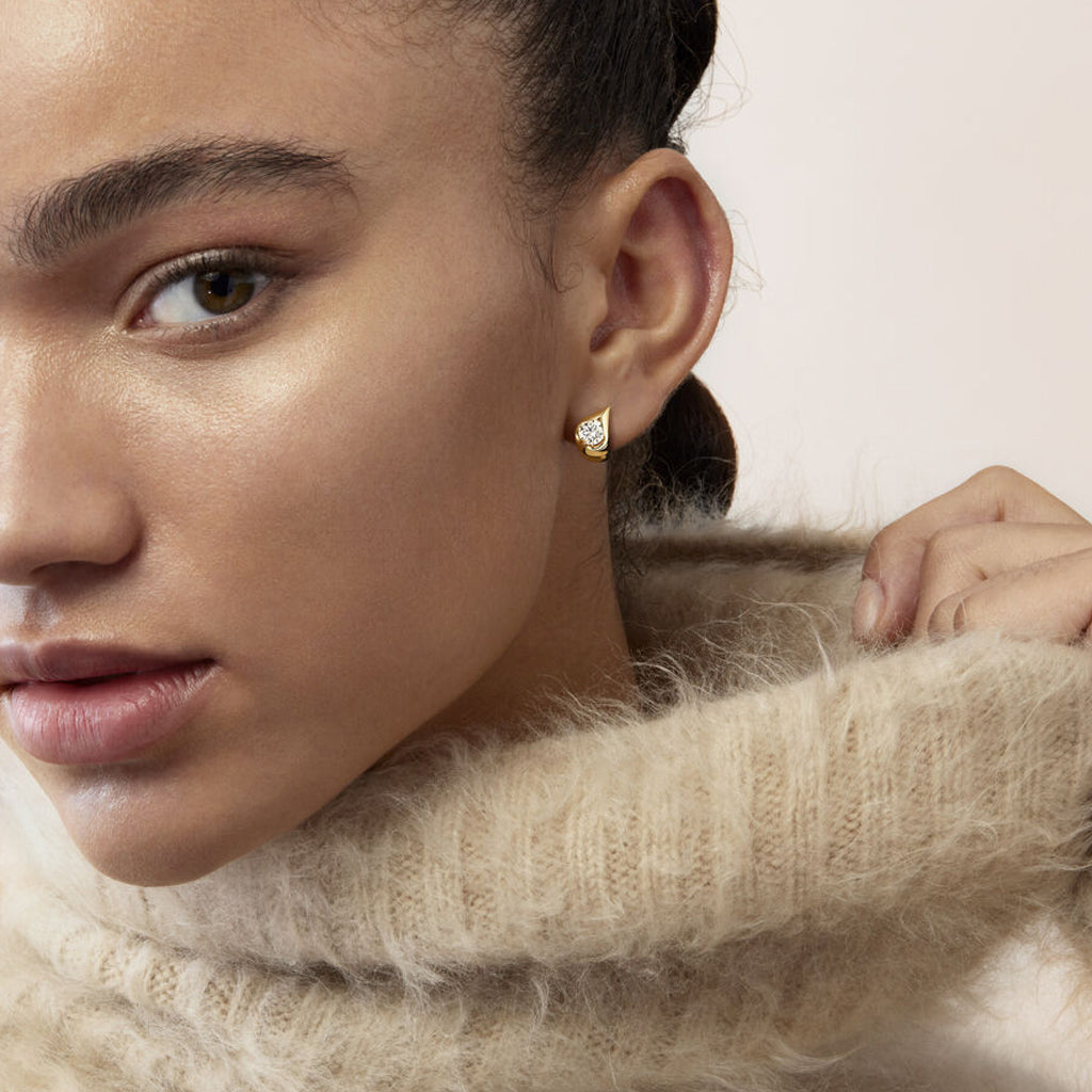 The LU Droplet Huggies feature sleek curves that wrap around the earlobes to create a contemporary look, while a unique diamond setting enhances the sparkle from the center stone