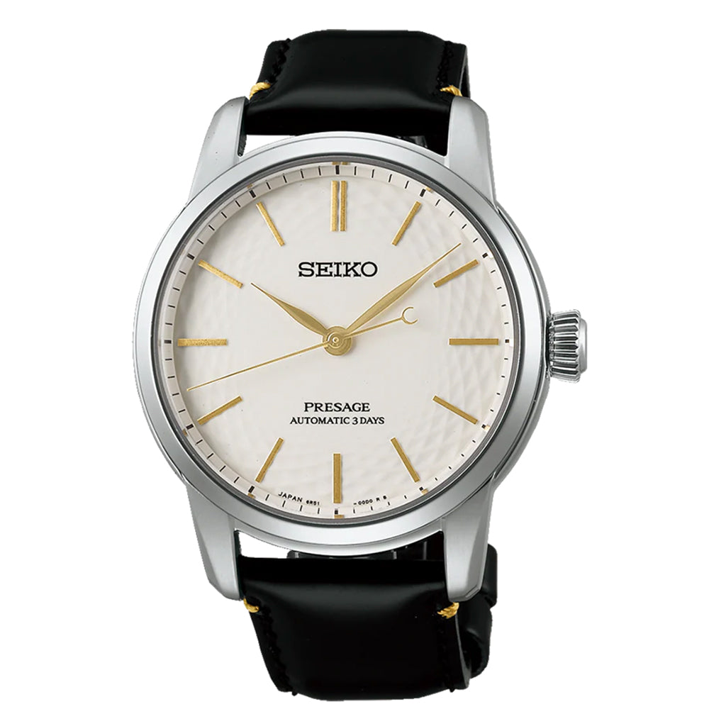 Presage Classic Series Arita Porcelain “Unglazed” Limited Edition. Offering the finest in Japanese mechanical watchmaking, the Presage Collection blends precision technology with superior craftsmanship and design. Arita Porcelain is among the classic expressions of Japanese artistry, used to create high-strength, three-dimensional dials, individually crafted by master artisans in a multi-step process combining technical innovation with centuries of inspiration. This extraordinary Limited Edition, available only in a controlled-production run of 1,200 with the serial number engraved on each screwdown see-through caseback, displays a warm white Arita Porcelain dial in its natural unglazed form, highlighting the curves and ridges of an impressive diamond-shaped pattern, enhanced by slim and contemporary gold-tone accents. With a power reserve of 72 hours, the 24-jewel automatic movement beats at a frequency of 21,600 vibrations per hour and offers manual winding capability. Crafted of stainless steel and topped with a dual curved sapphire crystal, this artfully crafted masterpiece is complemented by a glossy black leather strap, sourced from an LWG-certified tannery. 10 bar, 100M Water Resistant